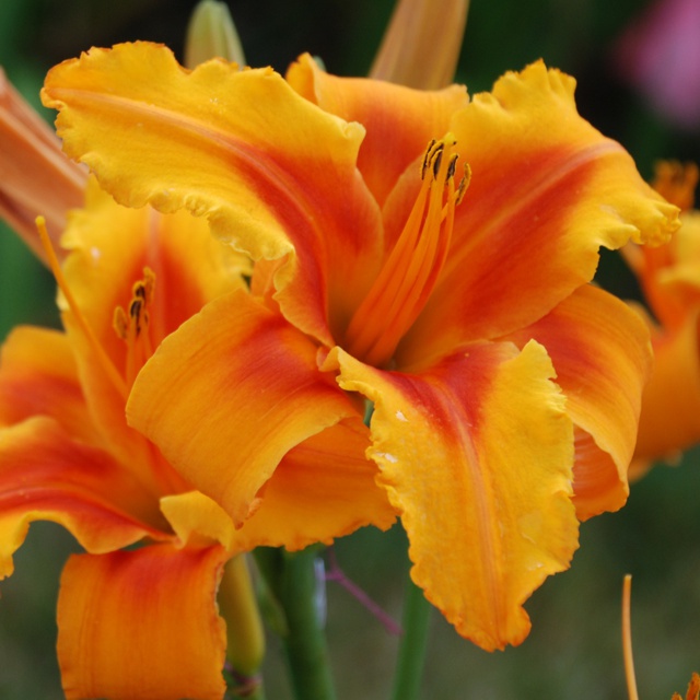 Samsational occasionally re-blooms, so you may get two or three stalks in a summer. The flowers vary somewhat in color each day, but the majority are brilliant red with yellow-orange edges and a dark near black center. In the right light, it makes amazing photographs. The following photo is not retouched – the flower was blooming in my garden beside my neighbour’s driveway, and they had a black pickup truck beside the flower. The blue tinge is a reflection of the light – it is not blue. But in the right light it does show blue reflections.