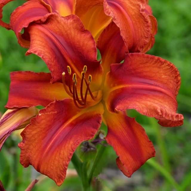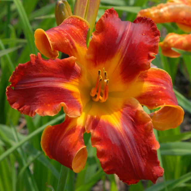 It has 7 inch flowers on a 30 - 35 inch stalks, and 18 - 25 buds that bloom from mid July to early August. Semi-Evergreen, very hardy in our northern climate and fertile both ways. It’s kids also show the intense brilliant red colors.
