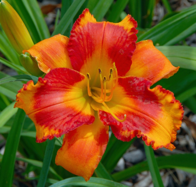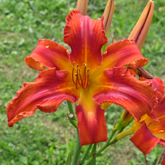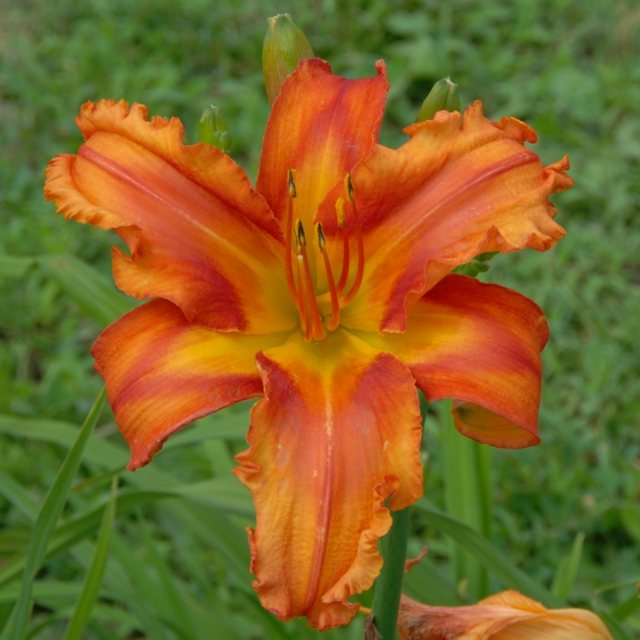 6 inch flowers on a 24 inch stalk, and 35 - 50 buds that bloom from mid July to early August. Semi-Evergreen, very hardy in our northern climate. Very fertile both with pod and pollen. Produces kids with high bud counts and brilliant colors.
