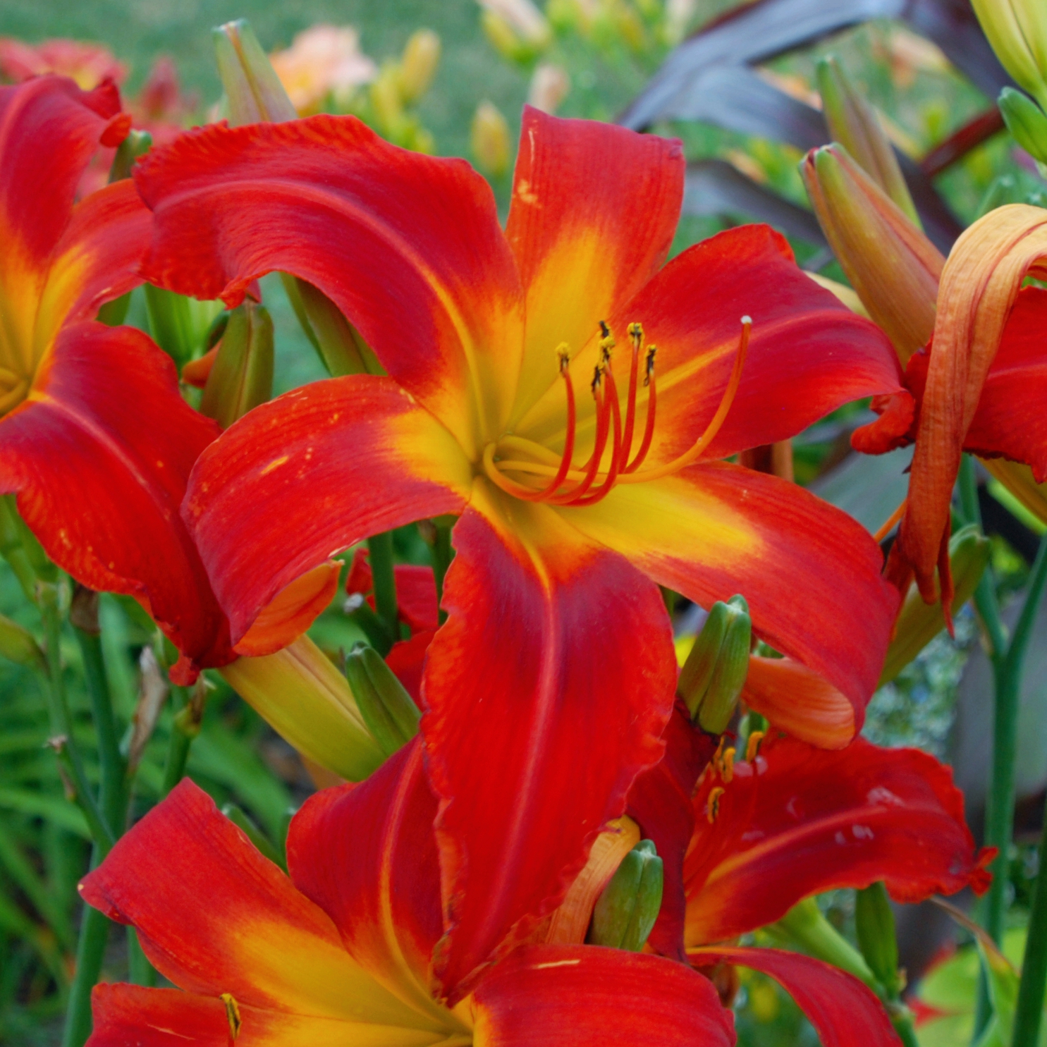 Our Daylilies are Yellow, Red, Purple, White, Gold, Orange, and many many combinations of those colors. I have been aiming for large brightly colored flowers and we have some 8 inches in diameter that shine from a distance in brilliant reds, oranges, and/or purples. Others are only 3 or 4 inches in diameter. Some are round, some are like spiders, and there are many different shapes. Some are short - about 12 inches high, and many are 3 feet to 4 feet tall. We have a wide variety and every day different ones will be blooming.